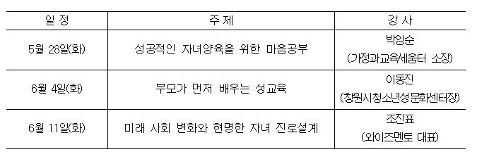 ▶ 일시: 5월 28일(화) ~ 6월 11일(화) 10:00 ~ 13:00 (매주 화요일, 총 3회) ▶ 장소: 아림고등학교 소강당 ▶ 대상: 경남도내 초/중/고/특수학교 학부모(강좌별 120명 내외) ▶ 세부 내용